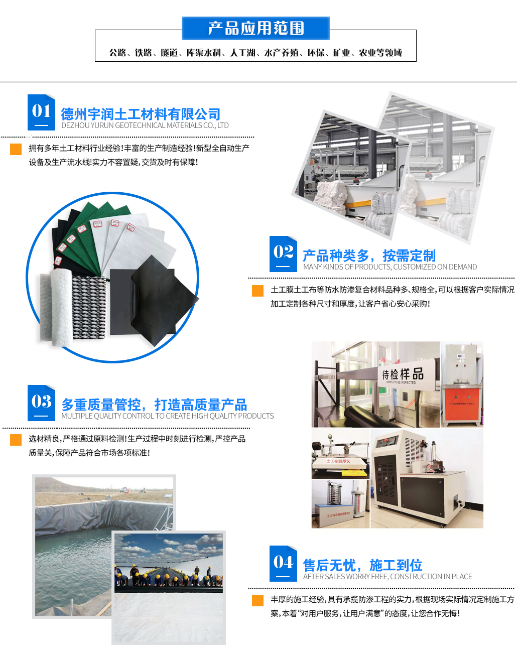 土工布在建築物的設計中,應充分考慮使用功能。如在城市主要幹道兩側的綠地、公共綠地及人行道上,應采取多層次布局方式;在建築物的設計中應注意使用功能。例如在城市主要幹道兩側,應采取多層次布置方式。在城市主要交通幹線兩旁,還可以采取多層次布置方式。土工布卷在安裝展開前要避免受到損壞。土工布卷應該堆放于經平整不積水的地方,堆高不超過四卷的高度,并能看到卷的識别片。土工布卷要用不透明材料覆蓋以防紫外線...